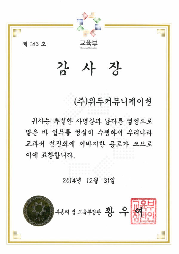 감사장 제 143호 페이지 정보 작성자 WeDu 댓글 0건 조회 5,794회 작성일 19-05-30 19:33 본문 2014-12-31 감사장 제 143호 교과서 선진화 부총리 겸 교육부장관 황우여 List Previous산업통상자원부 표창장 19.05.30 Next한국여성벤처협회 표창장 19.05.30