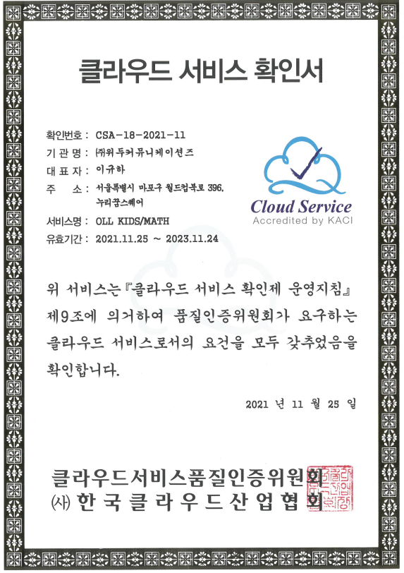 [한국/인증서] OLL KIDS/MATH 클라우드 서비스 확인서 페이지 정보 작성자 WeDu 댓글 0건 조회 9,287회 작성일 21-12-31 12:46 본문 2021-11-25 확인번호 CSA-18-2021-11 서비스명 : OLL KIDS/MATH List Previous[한국/확인서] OLL KIDS/MATH 파스-타 호환성 확인서 21.12.31 Next[한국/저작권] 장보기 인지훈련 게임 21.12.31