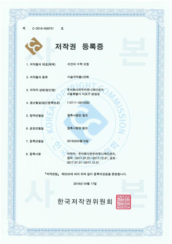 [한국/저작권] 리안의 수학 모험 페이지 정보 작성자 WeDu 댓글 0건 조회 5,844회 작성일 19-05-30 19:07 본문 2018-04-16 저작권 C-2018-009751 리안의 수학 모험 / 미술저작물>만화 List Previous[한국/저작권] 길리 19.05.30 Next[한국/저작권] 신입사원조기전력화 이러닝 콘텐츠 19.05.30